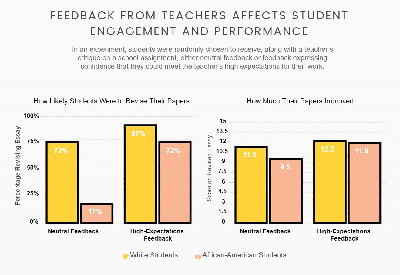A 2006 study compared the impact of two different Post-it notes added to students' essays: "I’m giving you these comments so that you’ll have feedback on your paper" and "I’m giving you these comments because I have very high expectations and I know that you can reach them." Students were given the option of revising their essay to respond to the comments and improve their grade. White students in the class, who had little reason to think that they might be judged according to the teacher’s stereotyped view of their race, were slightly more likely to revise their paper if they received the “high expectations” Post-it, but the effect on them was quite small. Among the black students, however, the treatment and control groups behaved wildly differently. Just 17 percent of the black students who received the bland “so you’ll have feedback” Post-it revised their paper, compared with 72 percent of those who got the “high expectations” Post-it. At the very moment when a student might be gearing up to react to the teacher’s comments as a threat, a sign of the teacher’s personal disapproval or bias, the Post-it gave the student an alternative frame through which to view those comments — not as an attack, in other words, but as a vote of confidence that the student was capable of high-quality work.